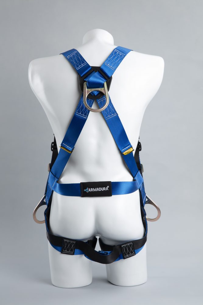 Arnés industrial cuerpo completo, parte de un sistema personal de detención de caídas, con diseño en H, provisto de 4 argollas en acero forjado.
