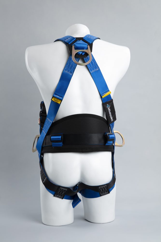 Arnés industrial cuerpo completo, parte de un sistema personal de detención de caídas, con diseño en H, talla única, provisto de 4 argollas en acero forjado.