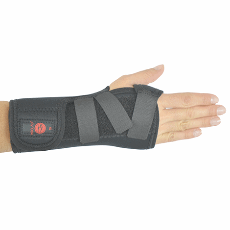 Órtesis de muñeca en neopreno que conserva el calor corporal, lo que puede ayudar y acelerar el proceso de recuperación, diseñada para la mano derecha, con férula en aluminio palmar, inmovilizadora de la articulación, en posición funcional.