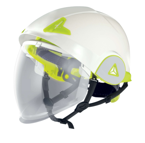 Casco de obra de doble carcasa, equipado con visera, para protección contra arcos eléctricos y salpicaduras de metal fundido.