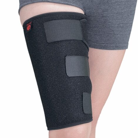 Órtesis en neopreno afelpado abierta, graduable, con cierres de contacto de alto agarre que se ajusta al muslo de acuerdo a su necesidad, conserva el calor corporal, mejora la circulación, promueve la recuperación del tejido muscular en ésta zona